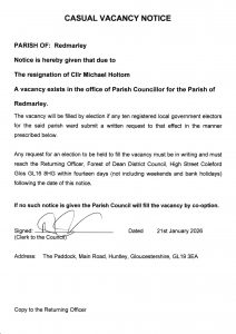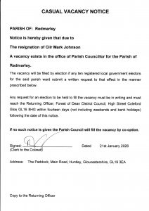 There are several vacancies for Parish Councillors in Redmarley. If you would be willing to be considered please email the Clerk Leo Williams on redmarleypc@gmail.com.